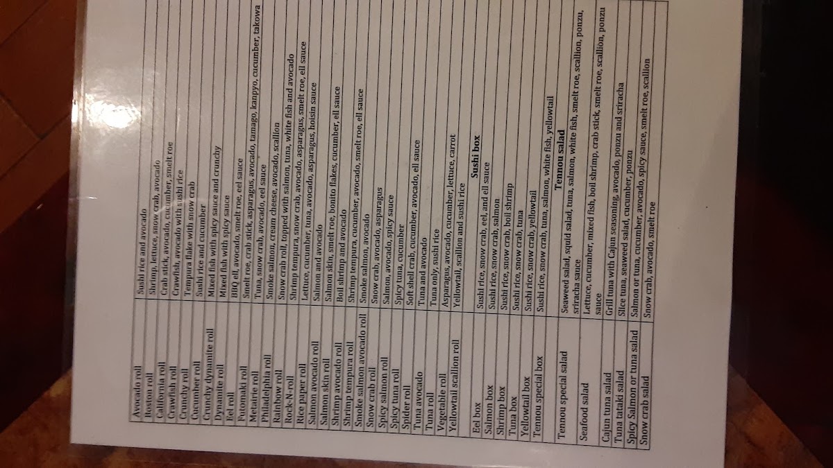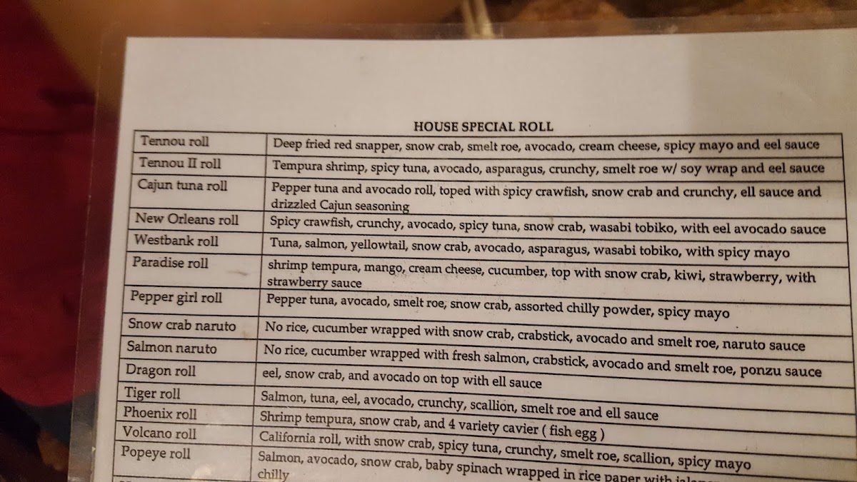 5 pieces. Shrimp tempura, snow crab, avocado, asparagus, smelt roe, and eel sauce.
